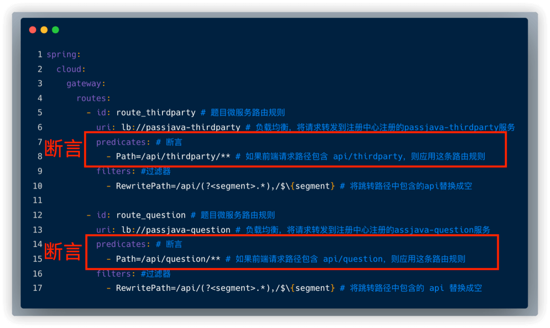 断言配置的示例如下,配置了两个路由规则,有一个 predicates 断言配置,当请求 url 中包含 api/thirdparty,就匹配到了第一个路由 route_thirdparty。